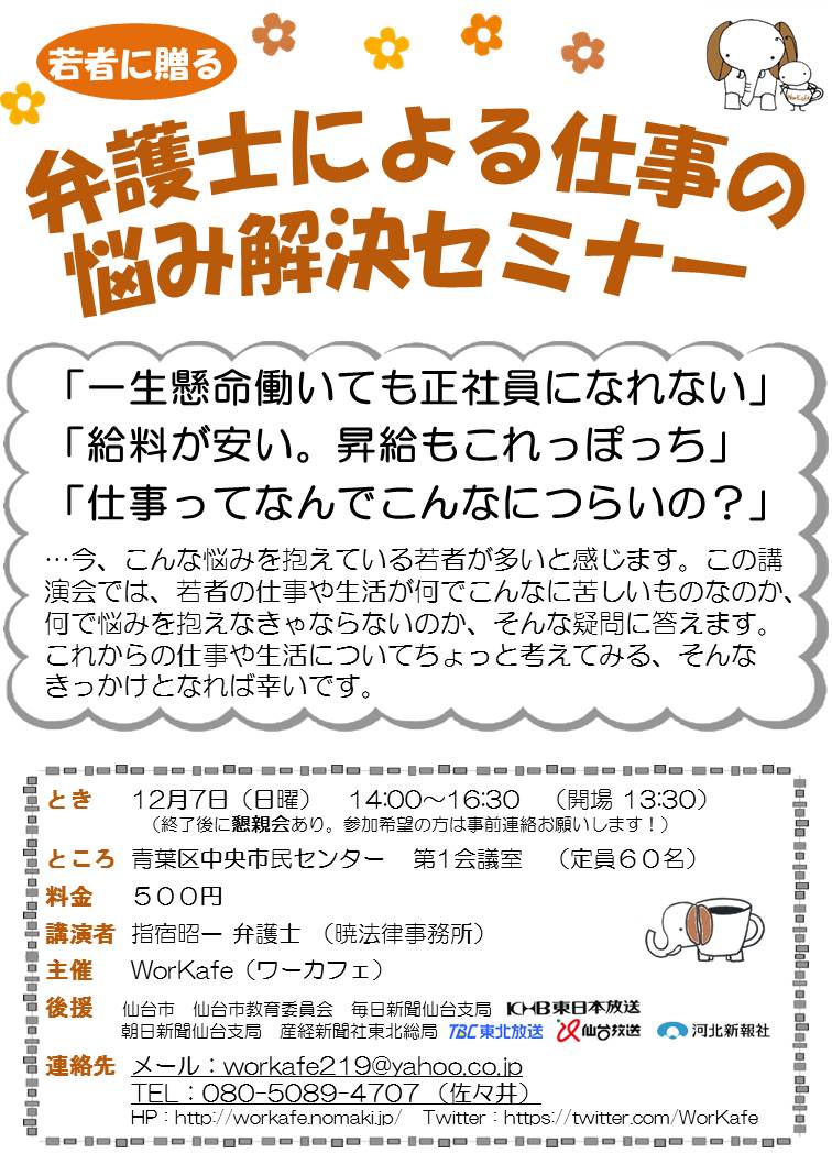 悩みを解決するにはまず労働相談から。相談する相手は、友人、弁護士、あるいはWorKafe、さらに労働組合…誰かに一度相談してみないと、自分の抱えている悩みがどういう悩みか分からない場合だって多い。詳しい人に話を聞いてみる、相談してみることが第一歩です。